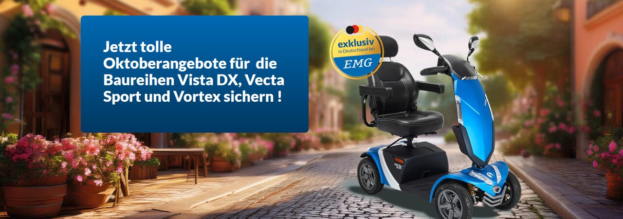 Wir bieten Ihnen in unseren Ausstellungen in Isernhagen k.B. und Duderstadt eine umfassende Auswahl an Elektromobilen. Diese reichen vom Kompaktmobil, welches sich einfach und schnell ins Auto transportieren lässt, bis hin zur Vision Vortex.